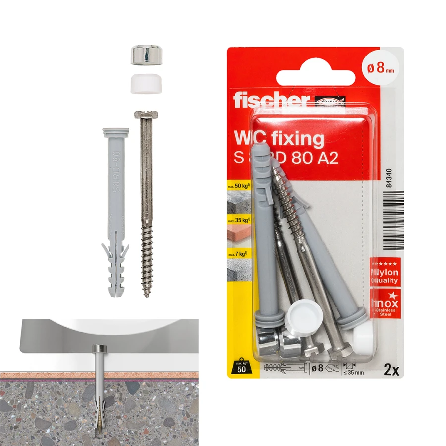 • Complete fixing set with plug, screw and cover cap.